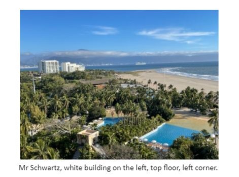 Fred and I recently met Mr Schwartz, age 96, a bright, energetic, long-tenured timeshare member (1993) at Vidanta resort near Puerto Vallarta. After the death of his wife in 2010, Mr Schwartz started spending 4 to 6 months a year at a 2-bedroom unit on a top floor overlooking the ocean. Each year family and friends of several generations known as the “Margarita Team”, coordinate for their 1-to-2 week Mexican vacation with Mr S.