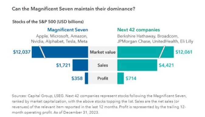 The Magnificent Seven continue to earn, profit and grow. They are investing in ongoing R&D and artificial intelligence (AI) to potentially drive growth in the coming years. Their stock prices, however, are getting expensive at roughly 30 times a dollar of earnings (p/e of 30) vs the general market at roughly 15 times (p/e of 15)